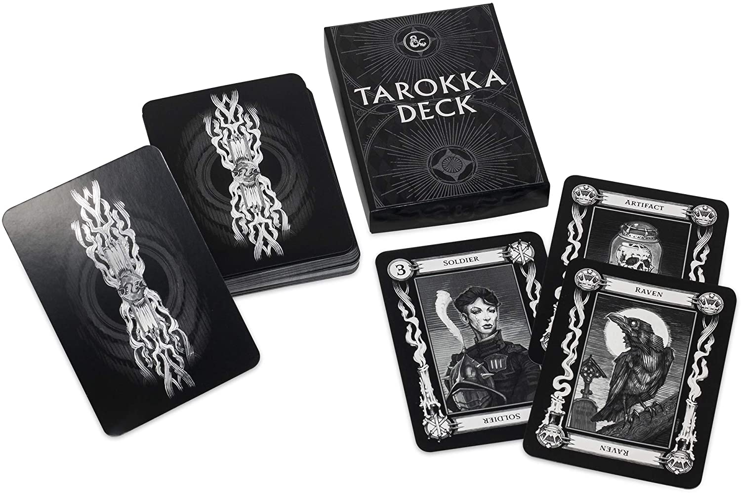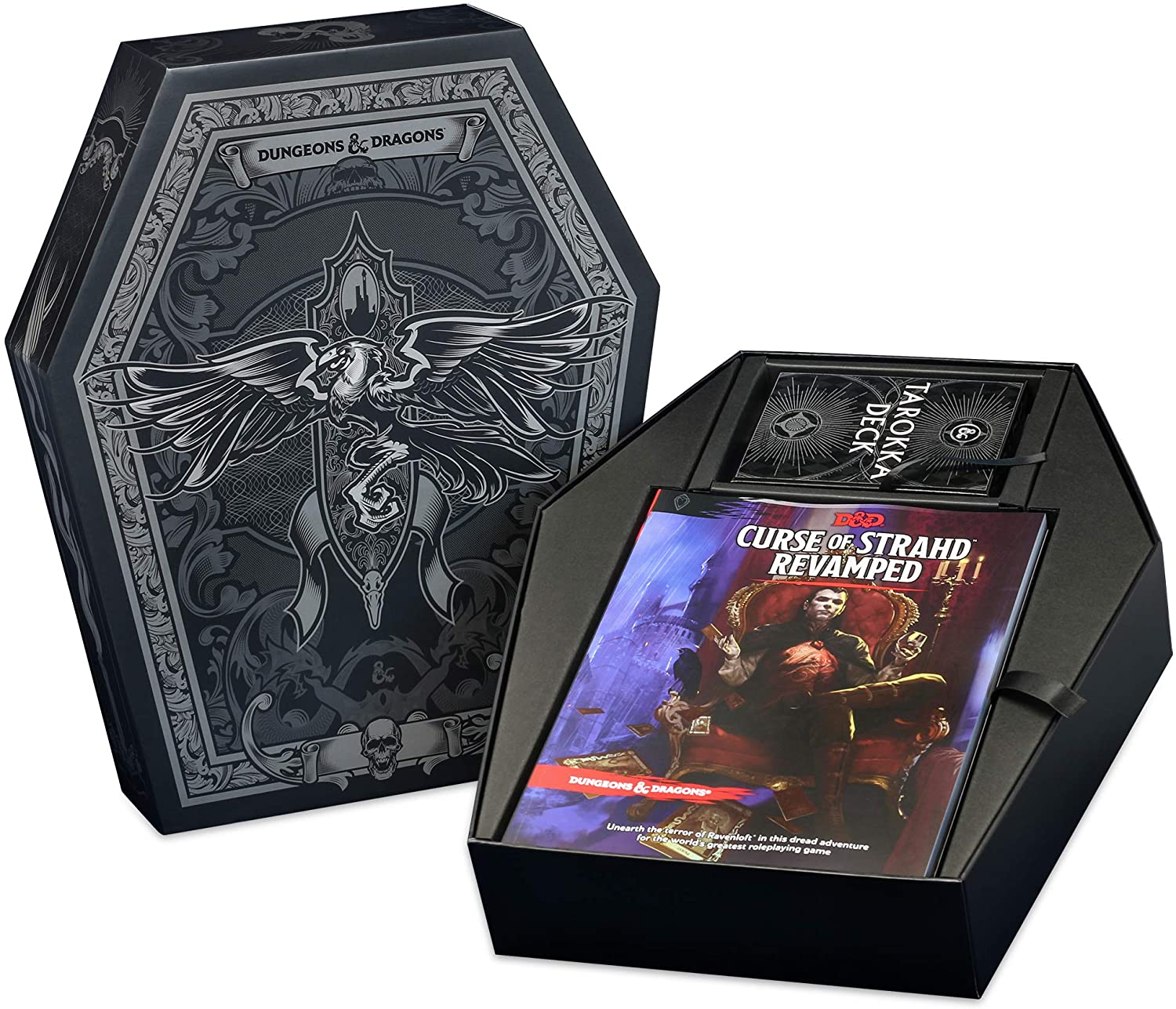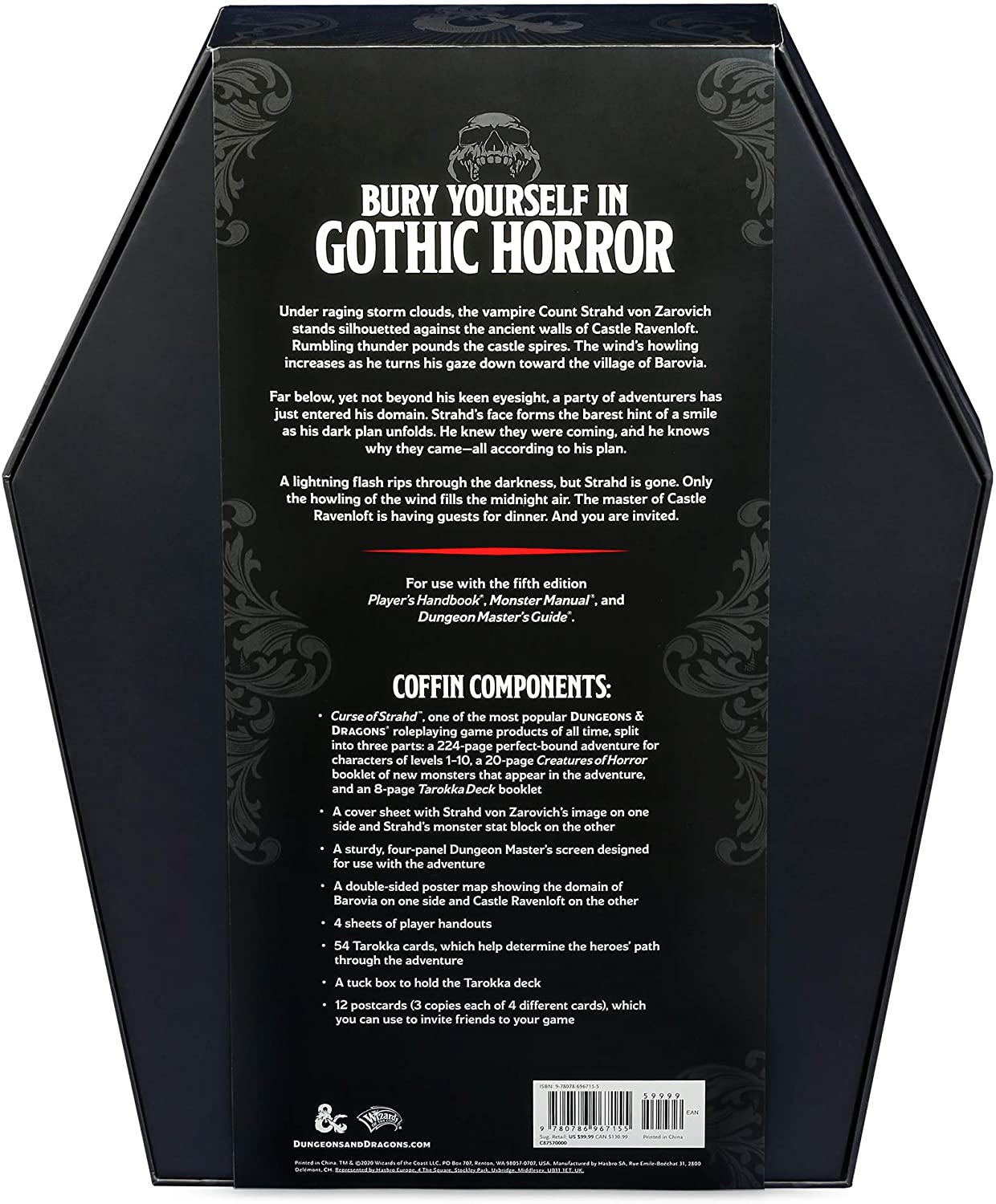 Coffin Components Curse of Strahd, one of the most popular Dungeons & Dragons roleplaying game products of all time, split into three parts a 224-page perfect-bound adventure for characters of levels 110, a 20-page Creatures of Horror booklet of new monsters that appear in the adventure, and an 8-page Tarokka Deck booklet. A cover sheet with Strahd von Zarovichs image on one side and Strahds monster stat block on the other. A sturdy, four-panel Dungeon Masters screen designed for use with the adventure. A double-sided poster map showing the domain of Barovia on one side and Castle Ravenloft on the other. 54 foil-stamped Tarokka cards, which help determine the heroes path through the adventure. A tuck box to hold the Tarokka deck. 12 postcards (3 copies each of 4 different cards), which you can use to invite friends to your game.